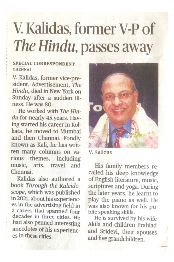 May the departed SOUL rest in peace. Can't forget the first meeting with Kalidas Sir, way back in August 2000. It was an interview meeting at the 2nd Floor Guest House of Kasturi Buildings , Churchgate. He was always really kind and welcoming in nature. I will always be thankful to Kalidas Sir for considering me for a posting in Mumbai Office. 15 years of my service with The Hindu Group of Publications began with his statement "Yes , you can join us". I do cherish those wonderful memories of working in Mumbai and this work opportunity with the group gave me the much required experience to not only earn a living for my family, but also bestowed upon me, rich and varied experiences of meeting so many people from various backgrounds as a part of media marketing life , which formed a strong foundation for my overall growth. Whatever I am today, whatever little bit I have achieved in life....began with the blessings of Kalidas Sir and later with immense support , guidance and motivation by Venkat Sir, Partha Sir, Suresh Sir , Sridhar Sir , Venkatesh B Iyer and colleagues from Mumbai office and from other cities as well. Kalidas Sir played a big role in keeping the flock together at The Hindu Group of Publications. Will miss you Kalidas Sir and also will miss your Facebook posts which were always noteworthy.